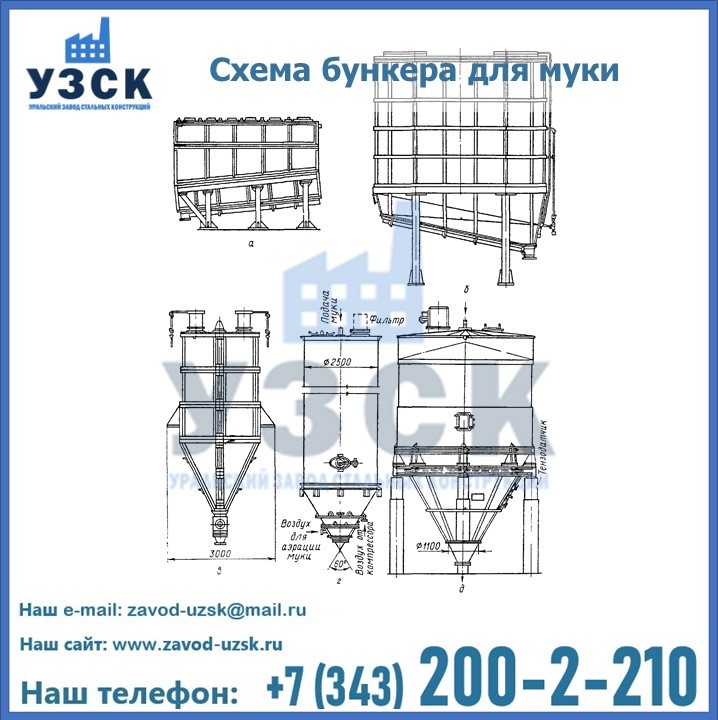 Завод «УЗСК» в Орске проектирует, производит и поставляет целевое оборудование, в том числе, бункеры для хранения муки и прочих сыпучих материалов.