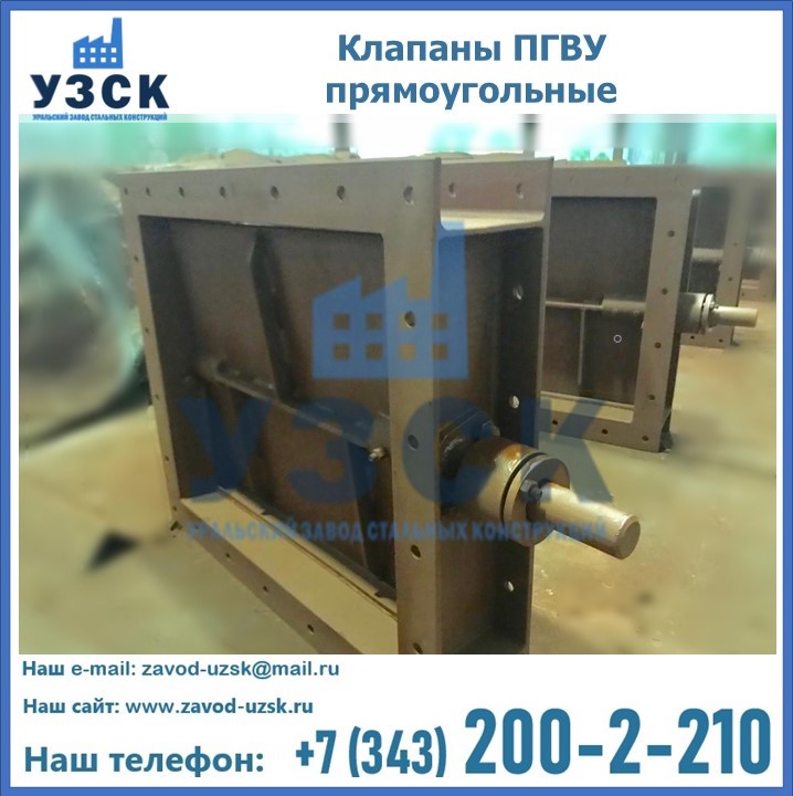 Прямоугольный клапан ПГВУ имеет прямоугольную или квадратную форму, по основному сечению конструкции, на которую устанавливается клапан. Для изготовления шиберов ПГВУ в Орске применяются сталь нержавеющая, углеродистая или низколегированная, в зависимости от модели. Внутри клапана имеется запорный элемент, передвигающийся параллельно общему потоку движения среды. Запорный элемент, или створка имеет такую же форму, как и основное сечение. Перемещение створки происходит благодаря возвратно-поступательным движениям.